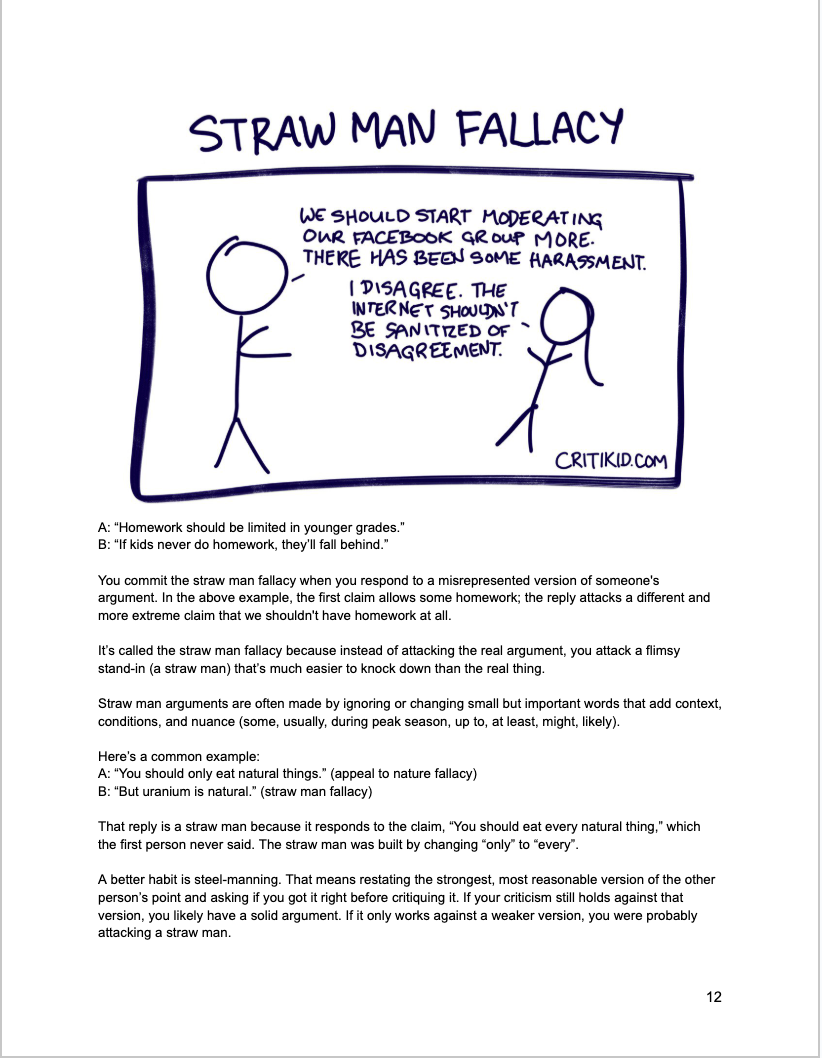 A printable handbook explaining 20 common logical fallacies with real-world examples. Recommended for teens and adults.